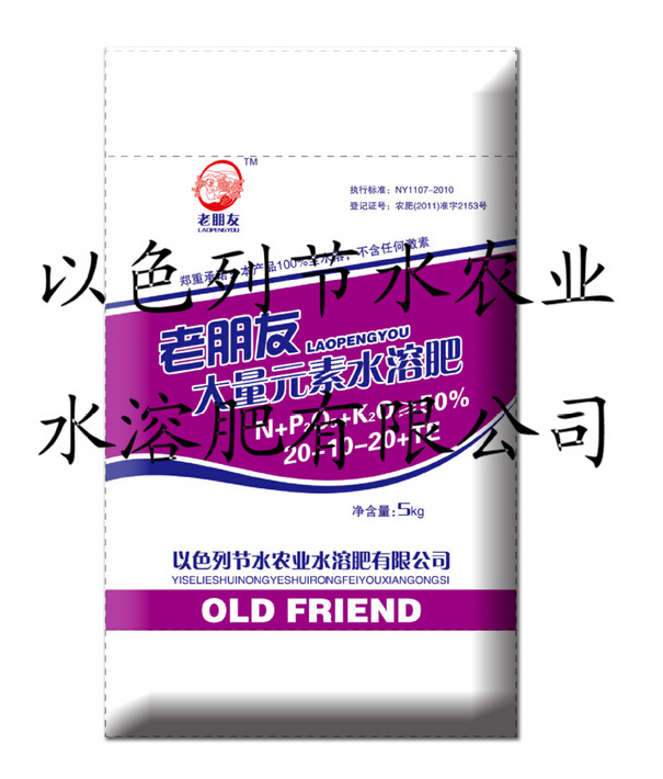 以色列节水农业水溶肥有限公司生产,由石家庄大化肥业有限公司国内营销的老朋友牌大量元素水溶肥(4袋*5公斤)(20-10-20+TE)采用新工艺配方及检测标准,选用进口原料生产的优质高效肥料,具有浓度高、养分齐 全、易吸收、肥效长等特点。对改良土地板结,提高果实品质,增强农作物抗病能力,增加农作物根系发育和叶面光合作用,提高养分吸收能力,大量促成花蕾形成和座果率,颗粒饱满程度,都有明显效果,既能提高产量又能增加质量。适用于果树、花卉蔬菜和各种经济作物及农作物种植。